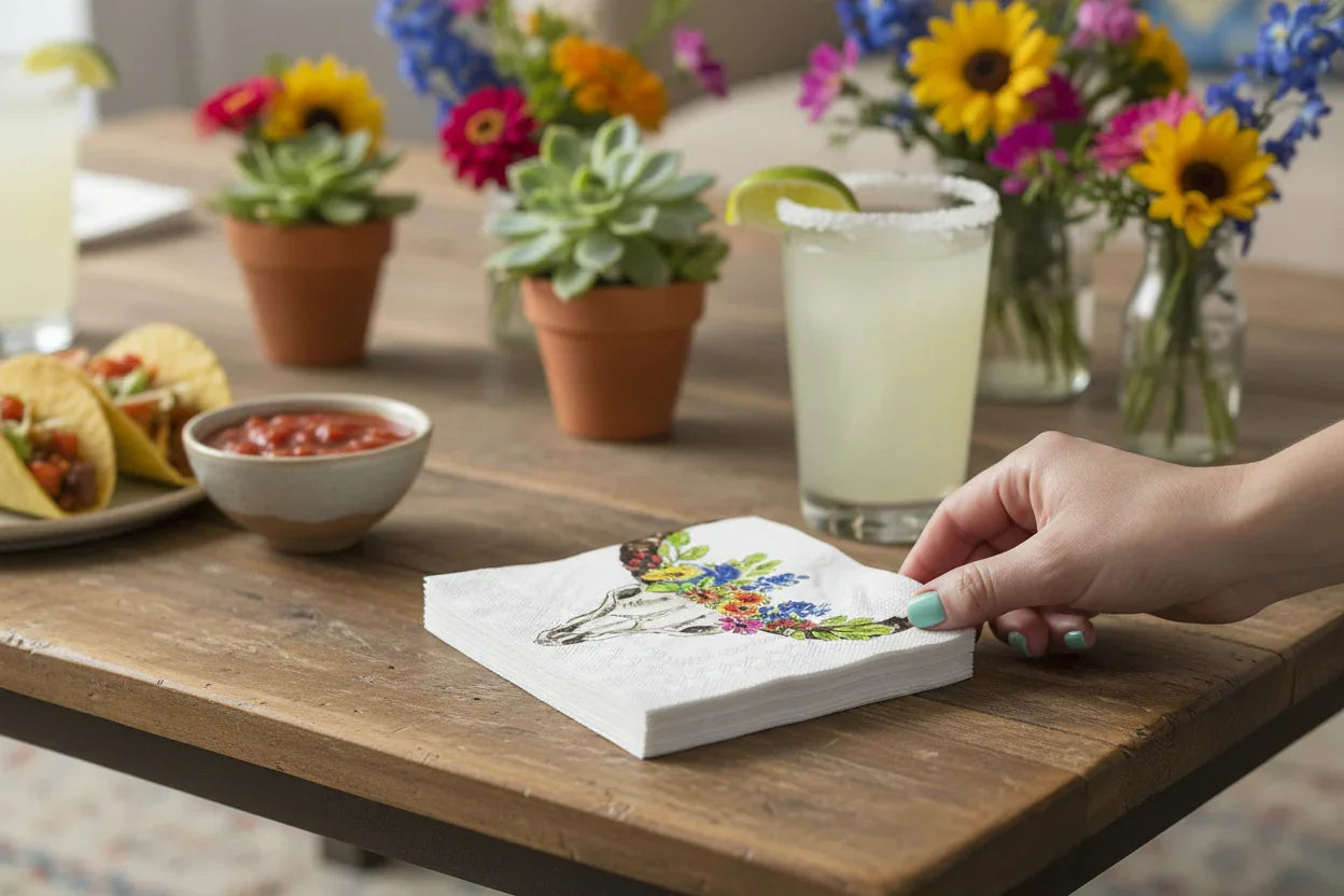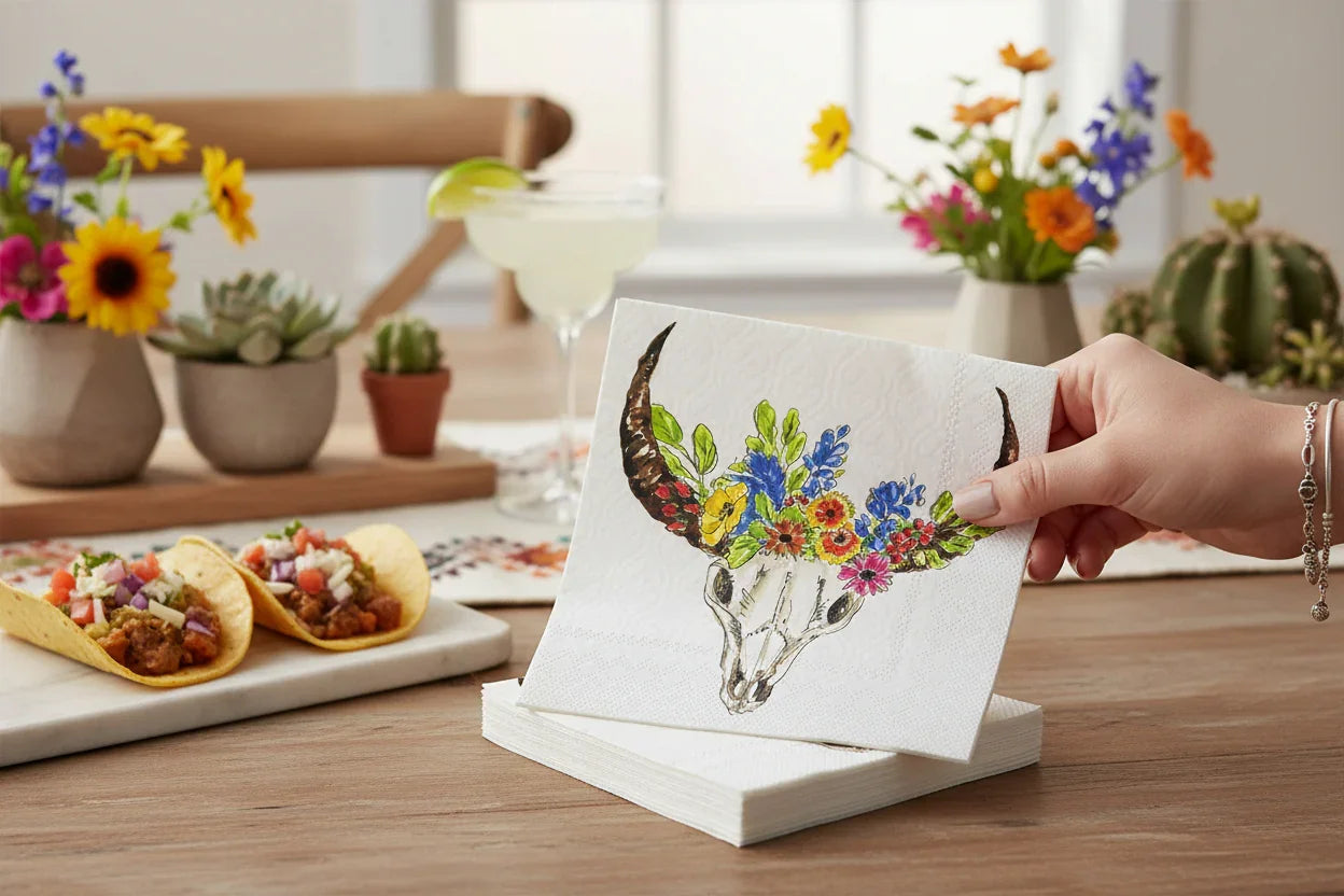 Add a touch of rustic elegance to your party with these vibrant floral skull cocktail napkins. Perfect for bohemian and southwestern-themed gatherings, they bring eclectic charm and bold color to any celebration. Unique, stylish, and sure to impress!