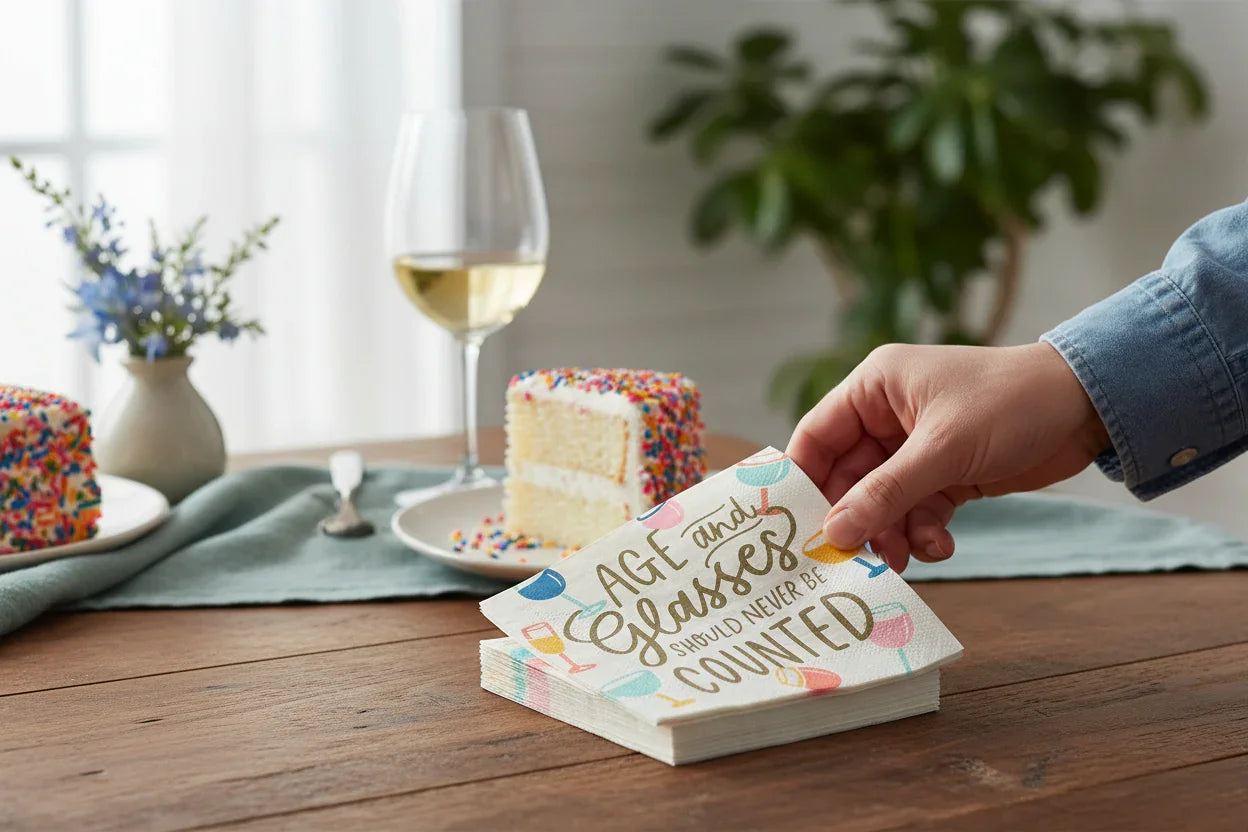 Age and glasses should never be counted! These fun cocktail napkins are a wonderful party accessory to complement good drinks and company. Combine them with cocktail mixers or other Shady Lady goodies for a personalized birthday gift. Cheers, friends!