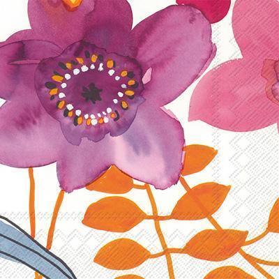 Bring out these fun floral cocktail napkins at your next friends' gathering to complement the drinks and company. This design features purple, pink, and orange flowers in a painterly watercolor style.